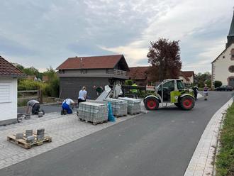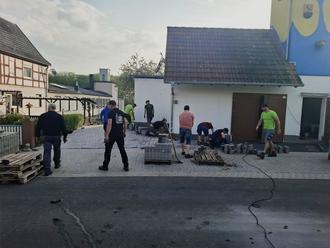 Im Zuge des Neubaus der Sigildisstraße wurde die alte marode Asphaltfläche rund um den Jugendraum entfernt und musste neu gepflastert werden. In den vorherigen Wochen hatte der Heimatverein gemeinsam mit dem Ortsbeirat schon viele Vorarbeiten erledigt. Der Kanal des Jugendraumes wurde erneuert, der Sockel wurde saniert und abgedichtet und das Schotterplanum wurde angelegt. Letzten Samstag war es dann soweit. 100qm Pflaster rund um den Jugendraum sollten verlegt werden und etliche Ecken waren zu schneiden. Es war unklar, ob wir alle Arbeiten an einem Tag erledigen können also wurde die Dorfgemeinschaft um Hilfe gebeten.