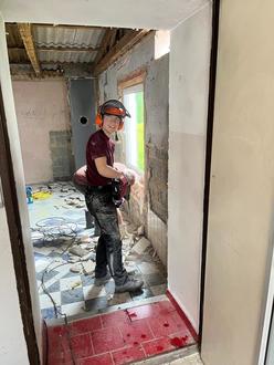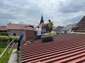 Weitere Aufgaben waren nicht weit entfernt. Der Jugendraum wird gerade gemeinsam mit dem Gesangverein saniert und zu einem Vereinsheim für Alle erweitert. Nach einem kleinen Mittagessen kamen Stemmhammer, Gerüst, Teleskoplader und Traktoren zum Vorschein. Der Jugendraum wurde kurzerhand fertig entkernt, Fließen abgestemmt und entsorgt, das Gebäude eingerüstet, 80qm Blechdach abgenommen und die Unterkonstruktion entsorgt.