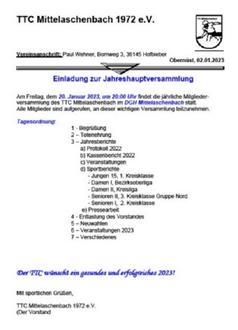 Am kommenden Freitag, 20.01.2023, 20:00 Uhr, findet unsere Jahreshauptversammlung im DGH in Mittelaschenbach statt. Eigentlich ist es nach der Gründungsversammlung am 29.12.1972 jetzt die 50gste Mitgliederversammlung.