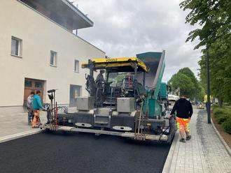 Auf den Fotos ist die bauausführende Firma bei den Asphaltierungsarbeiten zu sehen.