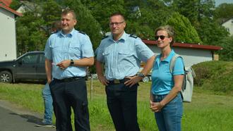 Beobachten den praktischen Teil der Wettkämpfe v.l.n.r.: 2. stv. GBI Ricardo Neumann, GBI Stefan Hohmann und Bürgermeisterin Marion Frohnapfel