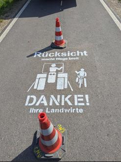 Kommen sich auf einem Weg Radfahrer und Traktorfahrer entgegen, wird es schnell eng. Moderne landwirtschaftliche Maschinen sind oft breit und haben auf schmalen Wegen kaum Ausweichmöglichkeiten.