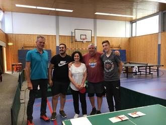 Das Bild zeigt eine Mannschaft aus unserem Turnier 2019; links TTC-Vorsitzender Paul Wehner, in der Mitte Anja Biedenbach, die Nüsttaler Sportkoordinatorin „gemeinsam aktiv“.