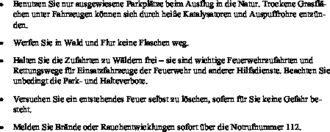 - Benutzen Sie nur ausgewiesene Parkplätze beim Ausflug in die Natur. Trockene Grasflächen unter Fahrzeugen können sich durch heiße Katalysatoren und Auspuffrohre entzünden.