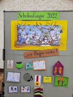 Unter dem Motto: „Wir sind flügge geworden, die Schulkinder machen sich auf ihren neuen Weg“ wurde ein Plakat gestaltet, auf dem ein Baum mit Vogelnest zu sehen war und blau-gelbe Vögel, die dabei sind das Nest zu verlassen und wegzufliegen. Jeder Schulanfänger hatte darauf seinen eigenen Vogel, mit Bild und Namen.