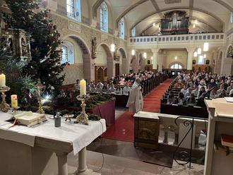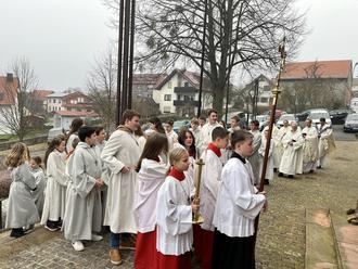 Bereits vor der dem Hauptportal der Kirche waren sie musikalisch von dem Trompetenduo Matthias und Philipp Flügel (Kermes) empfangen worden. Der Zug führte unter den Klängen der Orgel, an der Orgel Matthias Flügel (Boxberg), und dem kräftigen Gesang der Kirchenbesucher durch eine gut besuchte Kirche. Im Anschluss nach der Begrüßung der Gäste, zelebrierte Pfr. Gerhard zusammen mit den anwesenden Priestern und Diakonen den Festgottesdienst. Zur festlichen Gestaltung trug auch der Projektchor der Pfarrei bei.