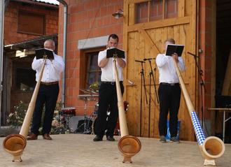 Die „Alphornbläser“ gaben einige Stücke ihres Repertoires zum Besten und begeisterten das Publikum. Simon Herr berichtete anschließend über den Werdegang des Trios mit Matthias und Philipp Flügel.