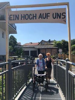 Die älteste Mitbürgerin der Gemeinde Nüsttal, Frieda Weber aus Rimmels, ließ es sich als Hundertjährige nicht nehmen, als erste über die Nüstbrücke zur Dorfscheune einzumarschieren.