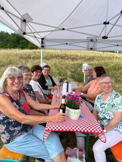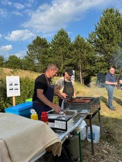Der Verein hatte das weiße Zelt mit einem Spitzdach von der Jugendfeuerwehr geborgt, Tische und Bänke aufgestellt, Frau Herget hatte selbige mit weißen Tischtüchern gedeckt und dekoriert und die beiden tüchtigen Grillmeister Herr Hegmann und Herr Sann haben die Grillspeisen zubereitet.
