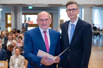 Am Nachmittag waren dann Kollegium, Wegbegleiter und Freunde von Markus Bente in der Aula zusammengekommen, die von Bentes Stellvertreter Matthias Leibold begrüßt wurden. Nach den festlichen Klängen des Blasorchesters „Bl-O-W“ unter Leitung von Martin Genßler mit dem Stück „Big Skye Ouverture“ von Philip Sparke würdigte Christian Pießnack, Dezernent für Gymnasien und Gesamtschulen am Staatlichen Schulamt Fulda, als direkter Dienstvorgesetzter den Werdegang von Markus Bente und überreichte ihm die Urkunde zur Versetzung in den Ruhestand.