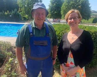 Oswin Kalb wurde am 17.03.1990 als Arbeiter für den Bauhof der Gemeinde Nüsttal eingestellt. Im Jahre 1999 legte er die Prüfung als „Geprüfter Wassermeister“ vor der IHK Dresden ab. So konnte er durch seine Vielseitigkeit und sein handwerkliches Geschick in vielen Bereichen des Bauhofes eingesetzt werden. Unser Bild zeigt Bürgermeisterin Marion Frohnapfel und Oswin Kalb zum Abschied im Freibad Gotthards. Gute Wünsche und ein kleiner Rückblick sind im Innenteil dieser Ausgabe zu finden.