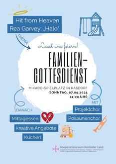 Am Sonntag, dem 7. September 2025, laden die Gemeinden des Kooperationsraums Hünfelder Land ein zu einem gemeinsamen Familiengottesdienst auf dem Spielplatz „Mikado“, Setzelbacher Straße in Rasdorf. Im Mittelpunkt steht dabei das diesjährige „Hit from Heaven“-Lied „Halo“ von Rea Garvey. Musikalisch mitgestaltet wird der Gottesdienst vom Kooperationsraum-Projektchor sowie von den Posaunenchören aus Burghaun und Erdmannrode. Im Anschluss gibt es Gegrilltes, Salate, Suppe, Kuchen und Getränke sowie ein Programm für Kinder. Bei ungünstigem Wetter findet der Gottesdienst in der Rasdorfer Stiftskirche statt.