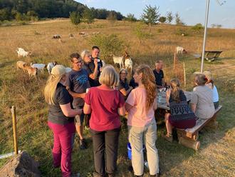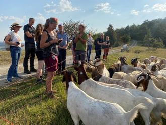 Unser Bild zeigt die Delegation im Gespräch mit Schäfer Oliver Käsmann- Bildmitte im grünen T-Shirt- der gemeinsam mit seiner Frau Jenny eine Ziegenherde präsentierte. Jennifer Käsmann bot eine eindrucksvolle Hüte-Vorführung ihres Bordercollies, der die Herde vom Ende der Weide zu der Delegation trieb.