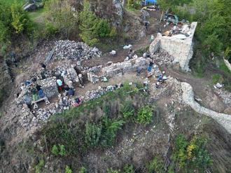 Wie vorgesehen, konnten während der Bauwoche die freigelegten Mauern des 2020/21 freigelegten Ostflügels vollständig in Ordnung gebracht werden: Die verwitterten und ausgewaschenen Fugen wurden, wie im Mittelalter, mit Kalkmörtel neu hergestellt; die Mauerkronen stabilisiert und teilweise ergänzt. Besonderes Augenmerk lag auf dem korrekten Wiedereinpassen der behauenen Sandsteine von Fenster- und Türgewänden. In dem knapp 20 Meter langen Mauerzug ist die gesamte 500-jährige Baugeschichte der Burg vertreten. Erstmals erwähnt wurde die Burg Haselstein im Jahr 1113. Aus dieser Zeit stammen die Steinlagen an der südöstlichen Kante des Gipfelplateaus. Das jüngste Bauelement, ein aus bereits ramponierten Gewändesteinen höchst provisorisch eingebauter Durchlass, dürfte aus dem Dreißigjährigen Krieg stammen. Damals wurde die bereits verlassene Burg nochmals befestigt und als Zuflucht für die Haselsteiner Bevölkerung hergerichtet.