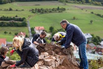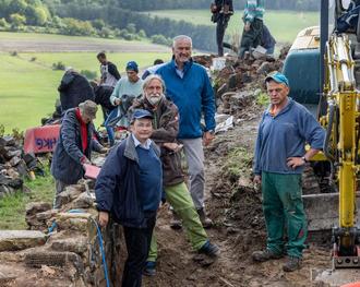 Die in den letzten beiden Jahren freigelegten Mauerzüge des Ostflügels der ehemaligen Ritterburg auf dem Haselstein sind restauriert und dauerhaft gesichert. Als Burgenbauer tätig waren, unterstützt von Angehörigen des Haselsteiner Geschichtsvereins, 23 Freiwillige des ‚Seminars für Burgenforschung‘ des Europäischen Burgeninstituts (EBI). „So viele Leute gleichzeitig haben seit dem Mittelalter nicht mehr auf der Burg Haselstein gewerkt“, freuen sich Vorsitzender Berthold Vogt und sein Stellvertreter Andreas Knüttel über die große Unterstützung.