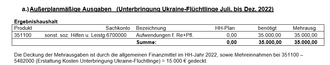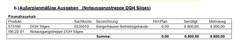 „Die Gemeindevertretung beschließt einstimmig, die außerplanmäßigen Ausgaben bei dem Produkt 35100 von insgesamt 35.000 € zu genehmigen und nimmt die außerplanmäßigen Ausgaben bei dem Produkt 573160 in Höhe von 8.800,00 € zur Kenntnis.“