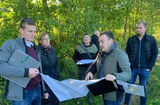 Unser Bild zeigt die Bauanlaufbesprechung Ende September mit dem Planungsbüro und der bauausführenden Firma, Bürgermeisterin Marion Frohnapfel und Vertretern der Unteren Wasserbehörde des Landkreises Fulda sowie der oberen Wasserbehörde beim Regierungspräsidium Kassel im Quellbereich der Hasel.
