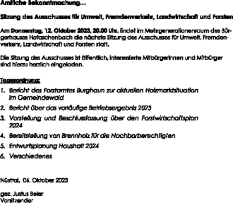 Am Donnerstag, 12. Oktober 2023, 20.00 Uhr, findet im Mehrgenerationenraum des Bürgerhauses Hofaschenbach die nächste Sitzung des Ausschusses für Umwelt, Fremdenverkehr, Landwirtschaft und Forsten statt.