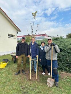 Mit vereinten Kräften: Mitglieder des Männergesangvereins Nüsttal Morles e.V. beim Pflanzen des Challenge-Baums auf dem Gelände der Grundschule Nüsttal in Hofaschenbach.