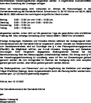 Wenn ein Internetzugang nicht vorhanden ist, können die Planunterlagen in der Gemeindeverwaltung der Gemeinde Nüsttal, Schulstrasse 19, 36167 Nüsttal vom 03.11.2022 bis 05.12.2022 während der nachfolgend aufgeführten Dienststunden