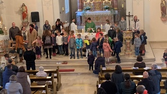 Zum Abschluss des Familiengottesdienstes durften dann noch alle Kinder nach vorne zum Altar kommen, um gemeinsam mit Kaplan Thomann, Frau Lauer und dem Chor mit dem Lied „Gottes Liebe ist so wunderbar…“ eindrucksvoll ihre Glaubensfreude zu zeigen.