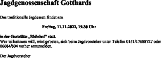 Wer teilnehmen will, wird gebeten, sich beim Jagdvorsteher unter Telefon 0151/17688727 oder 06684/804 vorher anzumelden.