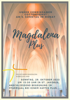 | St. Jakobus | 10:30 Uhr | „Magdalena Plus“ Gemeinschaftsgottesdienst der neuen Pfarrei mit der Kirchenband „Kirchencombo“ aus Roßbach - im Anschluss an den Gottesdienst Frühschoppen und Begegnung im Pfarrzentrum.für Eugenia Bott-Wiegand / für Bernhard Wiegand |