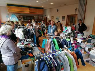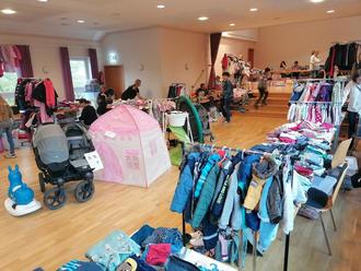 25 volle Tische und Kleiderstangen mit Baby- und Kinderkleidung, Schuhen, Spielsachen, Büchern und weiterem Zubehör wie Kinderwägen waren bestückt, als um 9:30 Uhr die Türen für die Besucher geöffnet wurden. Davor hatte sich schon eine lange Schlange Nüsttaler und von weiter her Angereisten angesammelt, die sich direkt an den Ständen verteilten und das große Angebot an Baby- und Kindersachen anschauten. Neben dem Verkauf gebrauchter Sachen wurde auch viel geredet und gelacht und die Stimmung war insgesamt fröhlich. Mit vollen Händen und glücklichen Kindern gingen die Besucher abschließend noch an dem Kuchenbuffet vorbei. Die Kuchen, Torten und Brezeln waren alle von Kindergarteneltern sowie lieben Nüsttalern gespendet. Vielen Dank nochmal dafür!