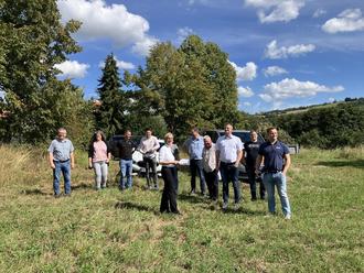 Begutachtet wurden die bereits durchgeführten Baumaßnahmen und noch anstehende Projekte, wie das Neubaugebiet „Am Wehr“ in Mittelaschenbach. Teilgenommen an der Rundfahrt haben die Mitglieder des Bauausschusses und des Gemeindevorstandes. Unser Bild zeigt Mitglieder des Bauausschusses und des Gemeindevorstands: v.l.n.r. 1. Beigeordneter Clemens Balzer, Sandra Hellmut, Andreas Kapelle, SB Dominik Sauer, BGMin Marion Frohnapfel, Christian Knüttel, Bernd Schädel, Manuel Gollbach, Fabian Hartung und David Flügel bei der Besichtigung des geplanten Neubaugebiets Mittelaschenbach.