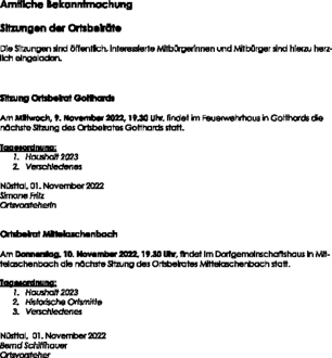 Am Mittwoch, 9. November 2022, 19.30 Uhr, findet im Feuerwehrhaus in Gotthards die nächste Sitzung des Ortsbeirates Gotthards statt.