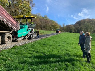 Unser Bild zeigt die bauausführende Firma bei Asphaltierungsarbeiten in der Gemarkung Haselstein. Bürgermeisterin Marion Frohnapfel macht sich mit dem Bauleiter ein Bild von den Arbeiten