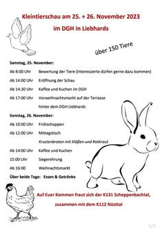 Die diesjährige gemeinsame Kleintierschau findet am Samstag 25.11. und Sonntag 26.11.2023 im DGH Liebhards statt.
