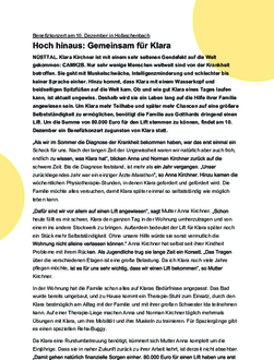 „Dafür sind wir vor allem auf einen Lift angewiesen“, sagt Mutter Anna Kirchner. „Schon heute fällt es mir schwer, Klara den ganzen Tag in der Wohnung umherzutragen und von einem ins andere Stockwerk zu bringen. Außerdem bedeutet der Lift für Klara später noch ein Stück mehr Selbstständigkeit. Ohne unsere Hilfe würde sie sonst vermutlich die Wohnung nicht alleine verlassen können.“ Anna Kirchner hat selbst seit ihrer Kindheit Probleme mit ihrem Rücken. Als Jugendliche trug sie lange Zeit ein Korsett. „Das Tragen über die verschiedenen Etagen ist eine große Belastung. Da ich Klara noch viele Jahre pflegen möchte, ist es für uns sehr wichtig, dass wir einen Lift bekommen“, so Mutter Kirchner.