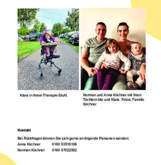 „Als wir im Sommer die Diagnose der Krankheit bekommen haben, war das erst einmal ein Schock für uns. Nach der langen Zeit der Ungewissheit waren wir natürlich aber auch froh, endlich zu wissen, was Klara hat“, blicken Anna und Norman Kirchner zurück auf die schwere Zeit. Bis die Diagnose feststand, ist mehr als ein Jahr vergangen. „Unser zurückliegendes Jahr war ein einziger Ärzte-Marathon“, so Anna Kirchner. Hinzu kamen die wöchentlichen Physiotherapie-Stunden, in denen Klara gefordert und gefördert wird. Die Familie möchte alles versuchen, damit Klara später einmal so selbstständig wie möglich leben kann.