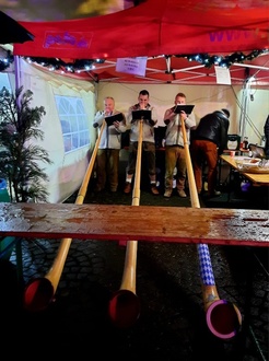 Anschließend lud der Heimatverein Hofaschenbach e. V. unter dem wachsamen Auge von Dr. Willy Herget zum gemütlichen Beisammensein auf den Adventsmarkt auf den Kirchplatz ein. Obwohl es fast ununterbrochen regnete, genossen zahlreiche Besucher die Leckereien, die an den liebevoll gestalteten Ständen angeboten wurden. Auch bei dem ein oder anderen Weihnachtsgeschenk konnte man noch fündig werden. Für das adventliche Ambiente sorgten die Alphornbläser und Adolf Trott am Akkordeon und nicht zuletzt ein großer leuchtender Weihnachtsbaum, ein Lagerfeuer sowie die in zartes Licht getauchte Kirche.