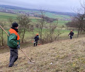Unser Bild zeigt die Mitarbeiter der Fa. Grümel, die im Auftrag des Biosphärenreservates Rhön den ökologisch wertvollen Kalkmagerrasen des Krengelsberges in den vergangenen Tagen entbuscht haben.
