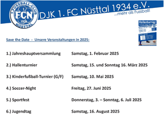 Hier eine Übersicht der weiteren Veranstaltungshighlight des DJK 1. FC Nüsttal 1934 e.V.: