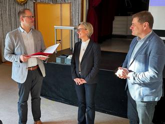 v.l.n.r.: Heiko Stolz- Vorsitzender der Bürgermeisterkreisversammlung im HSGB, Bürgermeisterin Marion Frohnapfel, Markus Röder- Präsident des HSGB