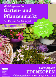 Die Saison für Gartenmärkte in der Pfalz wird in Edenkoben eröffnet. Die Innenstadt verwandelt sich an diesem Wochenende vom Ludwigsplatz über die Weinstraße bis zum Lederstrumpfbrunnen vor und im Kurpfalzsaal in ein blumiges Meer für alle Sinne. Mehr als 90 ausgesuchte regionale und überregionale Aussteller sind mit Ihren Produkten vertreten und präsentieren alles, was das Gärtner- und GärtnerInnenherz begehrt.