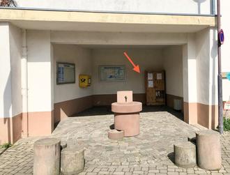 Er befindet sich in der überdachten Bushaltestelle neben dem Rathaus (ehemals Milchhäusl).