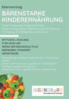 Das Jugendbüro der Verbandsgemeinde Edenkoben lädt alle Interessierte herzlich ein: Mittwoch, 29. April 2026, von 17.30 bis 19 Uhr in die Mensa der Realschule plus Edenkoben, Standort Weinstraße.