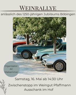 am 16. Mai 2026 feiert die Internationale Weinrallye ihre 25. Auflage. Aus diesem Anlass werden die Oldtimer auch durch Böbingen fahren und ihre fantastischen Fahrzeuge präsentieren.