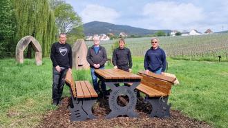 Stadtbürgermeister Lintz war sofort davon begeistert und unterstützte diese und befürwortete an den beiden Standtorten einen Austausch der bisherigen Tischgarnitur. Nachdem der von Ausschussmitglied Bernd Heene erstellte Entwurf gesichtet war, entschied man sich eine zweite Garnitur an der Hängematte aufzustellen. Bernd Heene kümmerte sich auch federführend für die Restauration der Kelteranlage und die Montage der Garnituren, die durch die Unterstützung des Teams Weinlehrpfad zügig durchgeführt werden konnte.