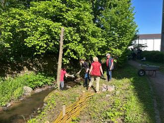 Der Praxisteil der Fortbildungsveranstaltung folgte im und am Gewässer. Dabei im Mittelpunkt: der Triefenbach, im Wald und auf der Rückseite der Verbandsgemeindeverwaltung. Untersucht wurde dabei unter anderem die Gewässergüte (mit Dr. Holger Schindler) und die Gewässerstruktur (mit Eva-Maria Finsterbusch). Arbeitsphasen mit Winfried Sander und Stefanie Semsei mit Schwerpunkten der geografisch-morphologischer sowie chemisch-physikalischer Ansprache waren ebenfalls auf der Tagesordnung. Praktisches Arbeiten im Triefenbach zur Verbesserung der Gewässerstruktur gemeinsam mit Bernhard Bäcker folgte. So wurden Stein-„Buhnen“ als Strömungslenker eingebracht, kleine „Faschinen“ (Astbündel oder Pfähle) in das Bachufer eingebaut. Bäume, Sträucher und Weide-Stecklinge wurden ebenso gepflanzt.