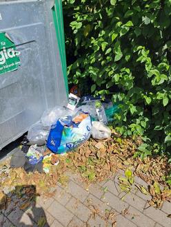 Es wurde am Glascontainer in Gleisweiler Hausmüll, Kartons, Biomüll mit Essensreste und Putzutensilien illegal entsorgt.
