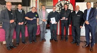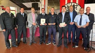 Für 15 Jahre aktiven und pflichttreuen Feuerwehrdienst erhielten Christoph Knebel (Böbingen), Martin Bechtold (Edesheim), Sven Neumann (Gleisweiler) und Rico Weinerth (Gommersheim), Andreas Müller (Venningen) das bronzene Feuerwehrehrenzeichen.