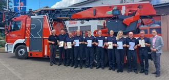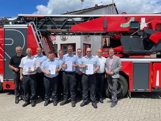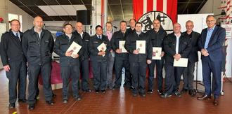 Für 25 Jahre aktiven und pflichttreuen Feuerwehrdienst erhielten Hartwig Giese, Kai Hammann und Martin Litty (Altdorf), Stefan Lambert (Burrweiler), Eric Walter und Nicole Meriemi (Edenkoben), Jochen Heinrich (Gommersheim), Jan-Dirk Beyersdörfer (Gleisweiler) und Christian Keller (Rhodt) das silberne Feuerwehrehrenzeichen.