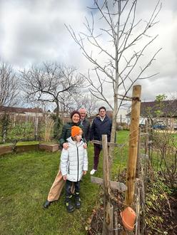 Eines der beiden Förderprogramme für die Bürgerinnen und Bürger umfasst einen Zuschuss für die Pflanzung von insgesamt 100 klimaresistenten Bäumen nach Vorbild des Klima-Arboretums in Flemlingen. Und ein solch klimaresistenter Baum steht seit wenigen Monaten bei Claudia und Christian Braun in Edesheim. Der Amberbaum war überhaupt der erste KIPKI-Klimabaum, der beantragt, von der Verbandsgemeindeverwaltung genehmigt und schließlich in Edesheim eingepflanzt wurde. Mitte Dezember schaute der Erste Beigeordneter Eberhard Frankmann kurz bei Familie Braun vorbei und sprach von einem guten Beispiel für gelebten Klimaschutz, das zum Nachahmen einlädt.
