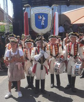 Der große Festzug durch unsere Innenstadt bildete den festlichen Abschluss des Wochenendes. Traditionell war Dinkelsbühl dabei mit der Knabenkapelle, den Schwedentänzern und der Feuerwehr Sinbronn vertreten. Besonders die alte Handspritze der Feuerwehr sorgte bei sommerlicher Hitze für eine willkommene Erfrischung unter den Zuschauern.