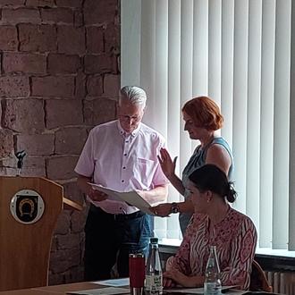 Anschließend wurde die neue Ortsbürgermeisterin, Barbara Haag, von ihrem Vorgänger, Lothar Anton, auf die Verfassung des Landes vereidigt und beglückwünscht. In ihrer Antrittsansprache betonte sie ihren Willen, die Ortsbürgermeisterin aller Gommersheimer/innen zu sein. Symbolisch für diesen Wunsch und die fraktionsübergreifende Zusammenarbeit beschenkte sie die zukünftigen Ratsmitglieder mit speziell entworfenen Gommersheim-T-Shirts.